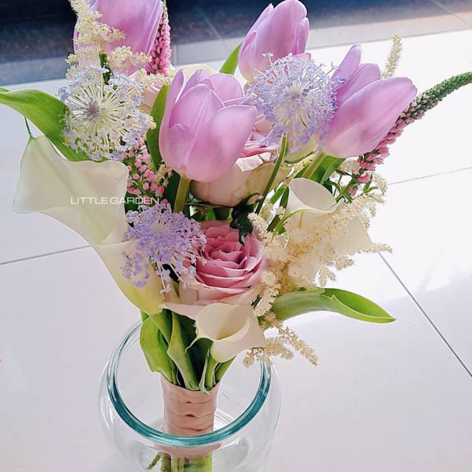 Calla lily, rose premium, tulip, trachymene ceorulea, astilbe, veronica