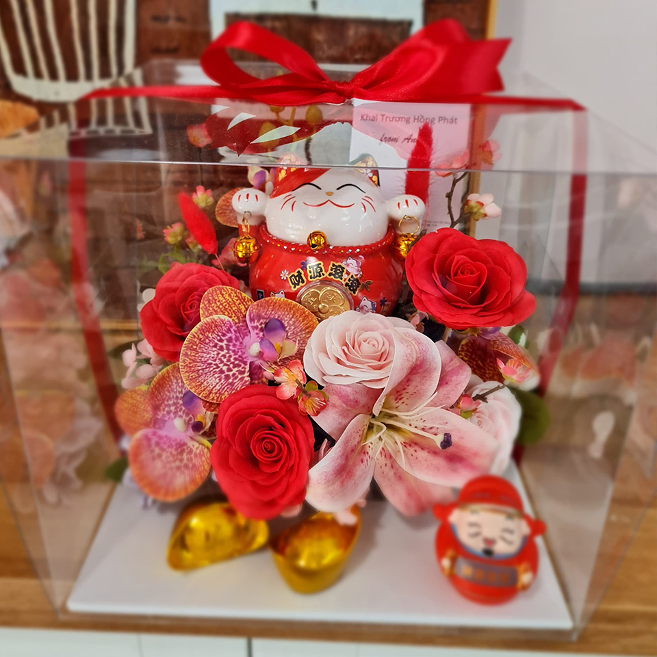 Mix Color Of preserved flowers and lucky cat (Maneki Neko)