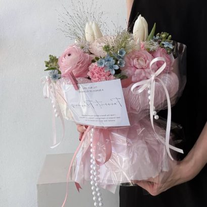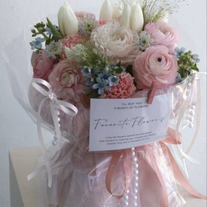 Tulip , ranunculus, carnation, oxypetalum with panicum