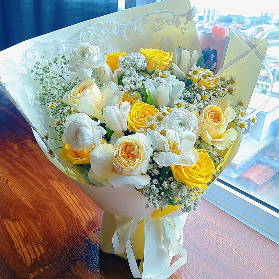 A charming bouquet of yellow roses, white tulips, ranunculus, chamomile daisies, and baby’s breath. The warm yellow and elegant white tones bring a fresh, joyful, and sweet floral arrangement perfect for any special occasion.