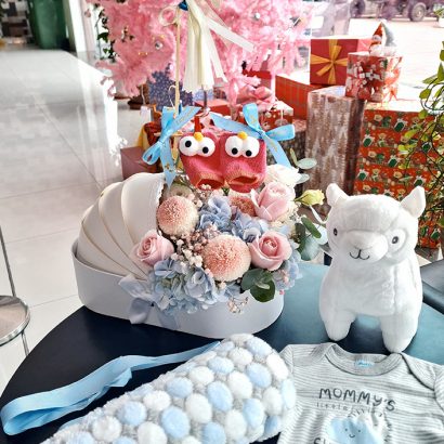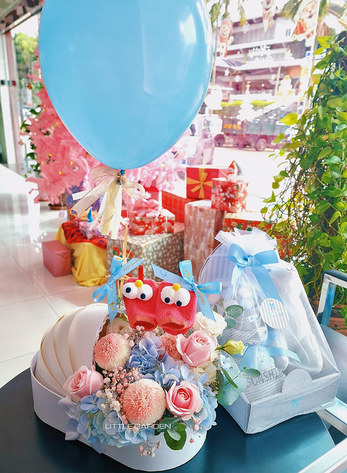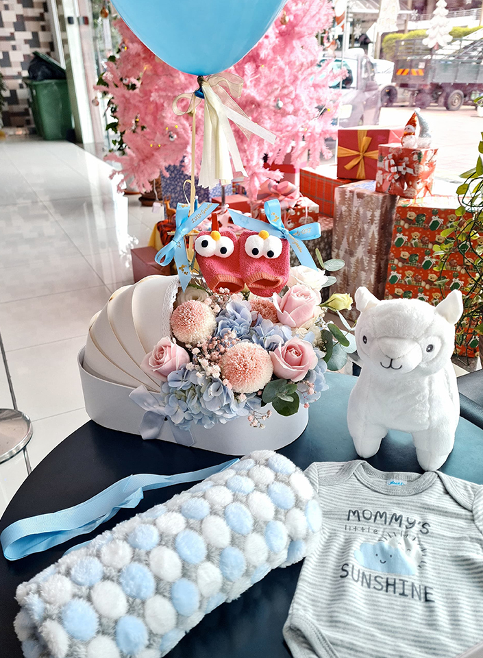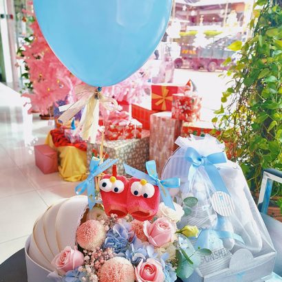 Celebrate new beginnings with our Blossom Joy Baby Gift Basket, a delightful mix of soft pink roses, blue hydrangeas, fluffy chrysanthemum pompons, and dainty baby’s breath. Adorned with adorable baby booties and a cheerful balloon, it’s the perfect gift to welcome a precious little one into the world.